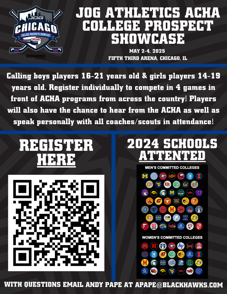 The JOG Athletics ACHA Chicago College Prospect Showcase, taking place May 2-4, 2025, at Fifth Third Arena, is available to boys players (16-21 years old) and girls players (14-19 years old). Players register individually and will be placed on teams competing in four games throughout the weekend, all scouted by over 50 ACHA programs from across the country. Additionally, players and parents are encouraged to attend our recruiting and coaching informational presentations. Here, players will learn about the ACHA as well as have time to individually meet with all the coaches/scouts in attendance.